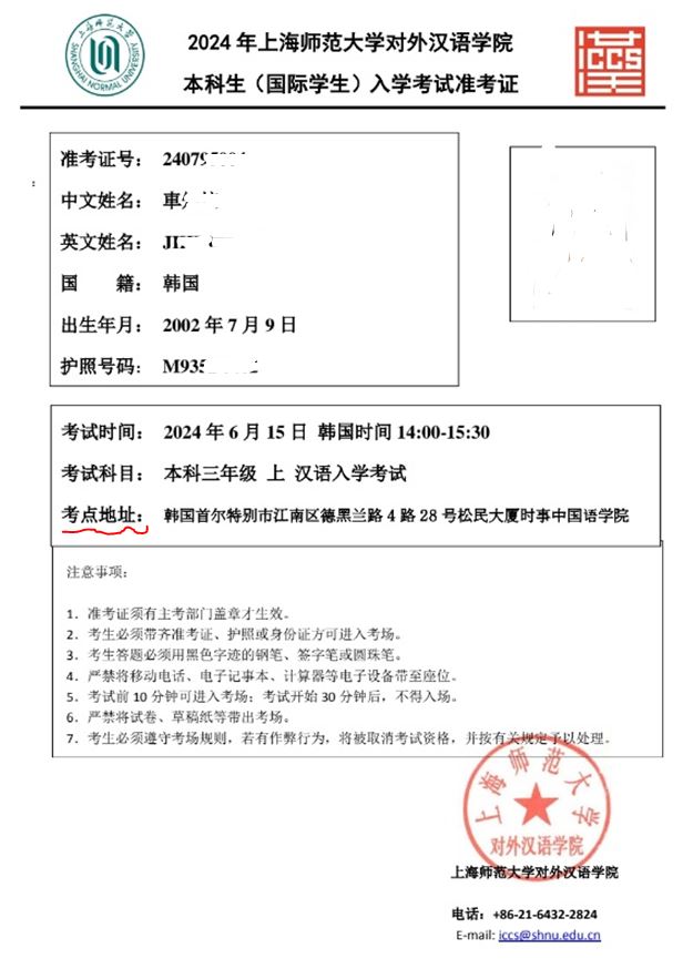 상해사범대학에서 공식적으로 시행하는 한국 편입시험접수처,한국고사장입니다.